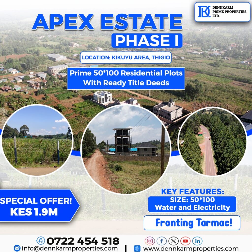 Stawi Gardens : 1/8th Acre Residential Plots In tandem with ongoing developments and growth in Thigio, DennKarm Properties brings Velma Court Phase II. The project is well situated within Kiambu counties and in Thigio, one of the fastest growing areas. And with proximity to Kikuyu and Limuru towns, Velma Court Phase II offers a unique